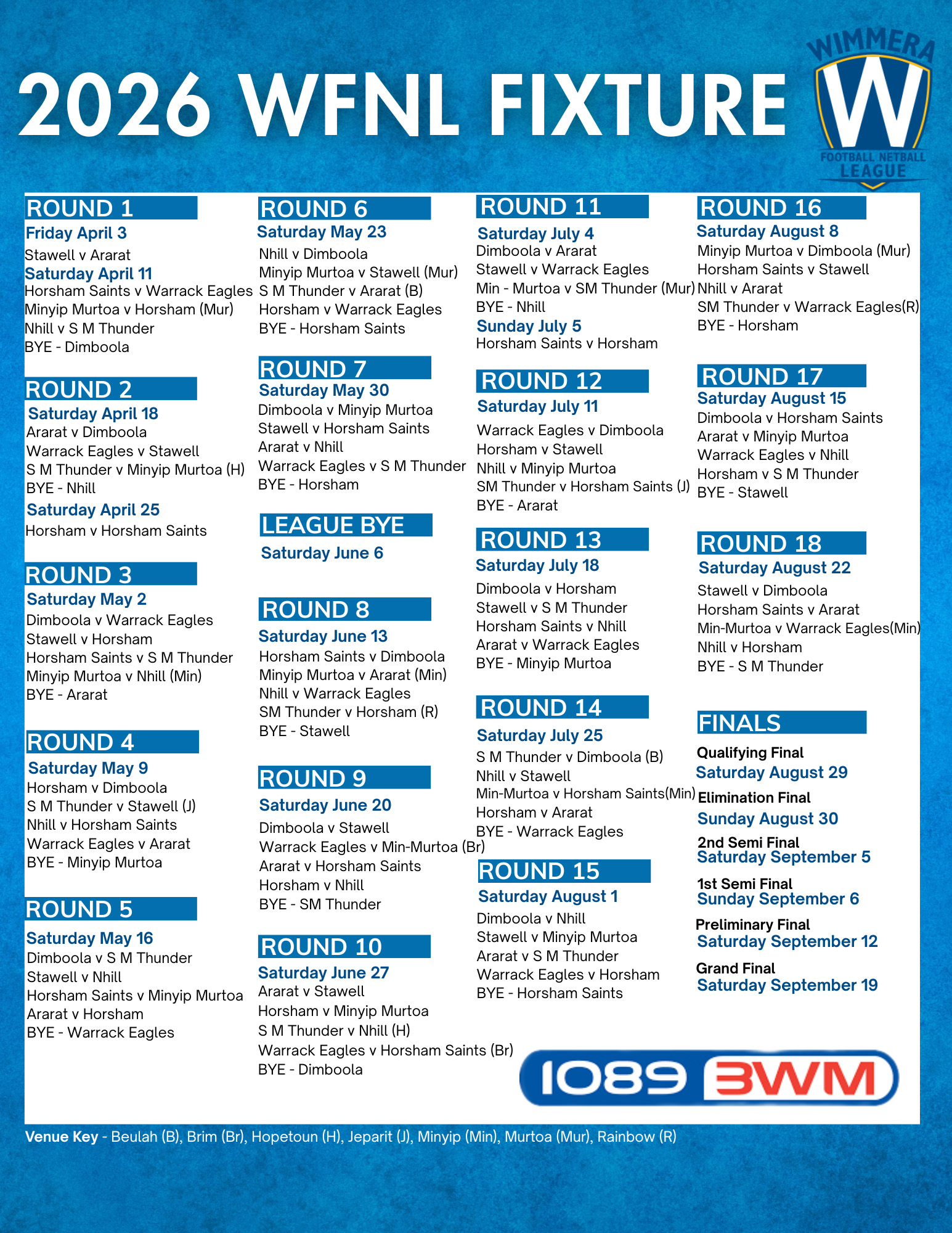 Football – Senior, Reserve, U17, U14, U11, U8, Burra Female Football (Senior) and AusKick (Minyip/Murtoa program, and now including a Horsham program).