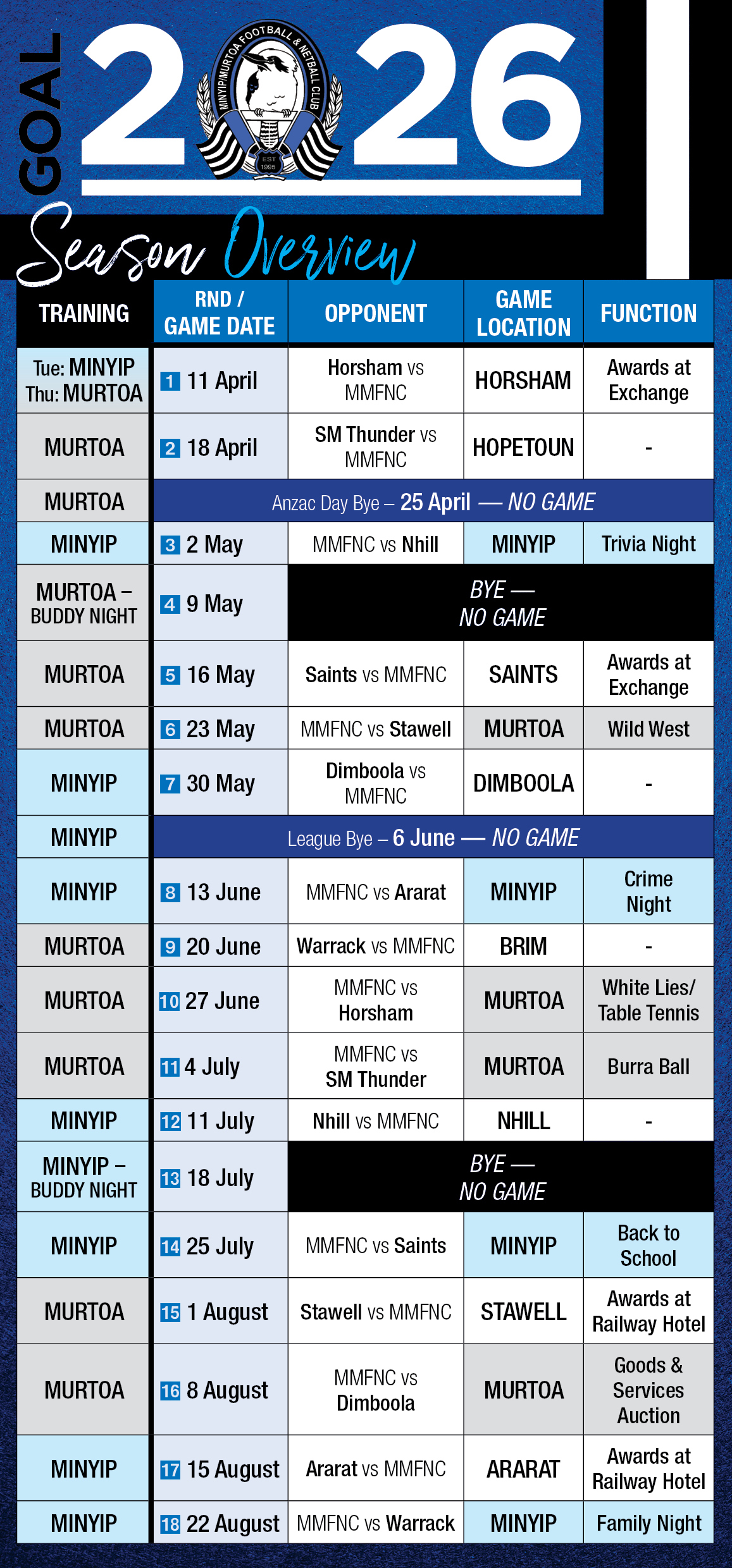 The Minyip/Murtoa Football & Netball Club is a community orientated Club competing in the Wimmera Football Netball League in Victoria’s Wimmera Mallee.